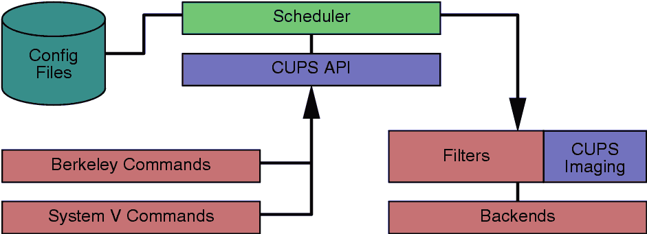 The scheduler also manages a list of available printers on the LAN and dispatches print jobs as needed using the appropriate filters and backends.