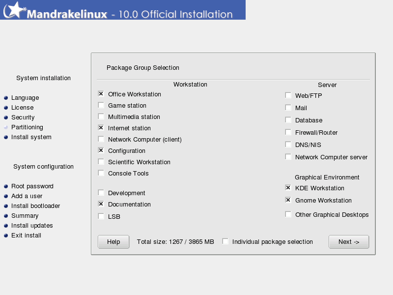 This level of install takes more time, but gives you the ability to fine tune your system at the program level. The only down side is that you might be wading through a VERY LONG List of programs. The package list for Mandrake Linux Version 10 lists 4674 programs you can select from. If you want a REALLY long list of available packages, try Debian Testing install, it contains 16343 packages. Don’t believe me check out this text file.