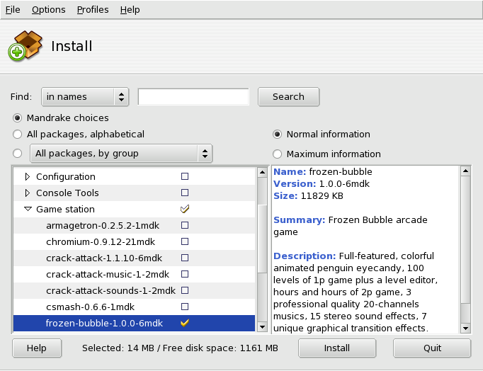 One additional feature of the install programs line RpmDrake is that they can work with packages from repositories on the internet. So, if you have a reasonable internet connection, you can use an installer to download and install a program, as well as use the initial CDs.