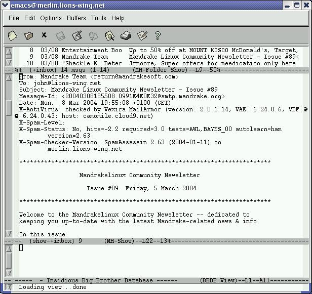 This is a particularly interesting use of Emacs for me. You see I started using Emacs for email under Linux with a email program called MH. This email program is designed to use small commands from the command line. You use one command to view email, another to check if you have mail, another to compose email, etc. This sounds tedious, but remember that I started using this on Text only terminals.