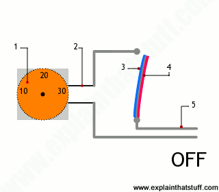 The bimetal strip forms part of an electrical circuit (gray path). When the strip is cool, it’s straight, so it acts as a bridge through which electricity can flow. The circuit is on and so is the heating. When the strip is hotter, it bends and breaks the circuit, so no electricity can flow. Now the circuit is off.