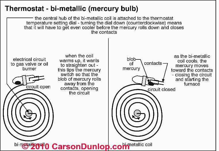 This thermostat uses a longer bimetal strip, but the switch uses a small blob of mercury to short the contacts. The basic operation is the same.