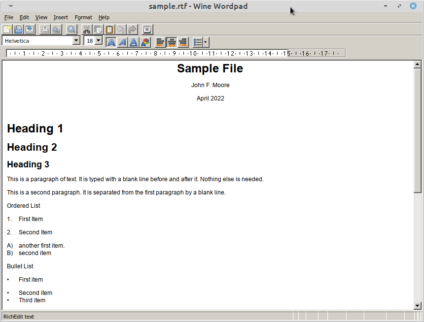 You can see a screen shot of what is looks like in the wordpad program wordpad sample.rtf
