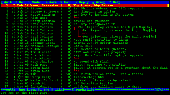 I am not going to pretend that I know of all the email programs available, I am just making a comparison of the major ones. One issue that comes up immediately is, do you want a graphical email program or a command line one? This is not necessarily an either or choice. You can have and use both types, in different places.